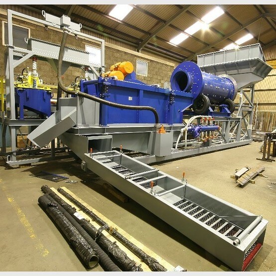 一套設備同時有振動和滾筒兩種篩分。既有振動篩的篩分效果、又有滾筒式的洗礦、還有破碎擦洗功能。 礦料經過料斗進入振動篩,經過篩分后大石塊廢料排棄,以免進入滾筒篩對其造成損傷,然后再進入滾筒篩進行洗礦、磨礦,對礦料進行擦洗.經過摩擦洗礦后廢料、雜草、樹根等廢物排出,含金的礦料進入溜槽或其它選礦機內進行選金。 溜槽內鋪設有橡膠粘金毯.可適應不同地形,環境.