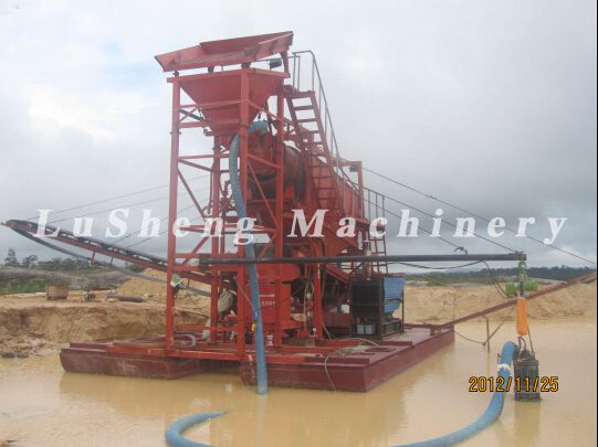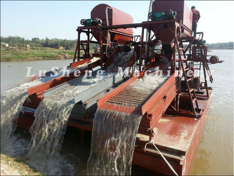上面說了淘金船的產(chǎn)量從小型的到大型不等,普通型號的時產(chǎn)量在100-300噸左右。下面來說一下淘金船的回收率。 淘金船的回收率是由選金系統(tǒng)決定的,河道含金的沙料開采上來后,需要進入篩分系統(tǒng)。
