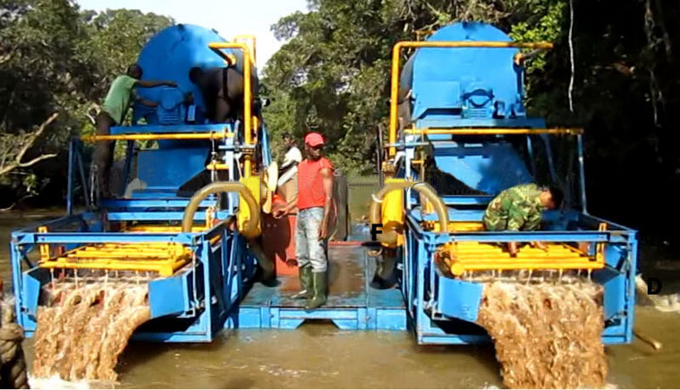 下圖為鼓動溜槽淘金船在云南施工現(xiàn)場: