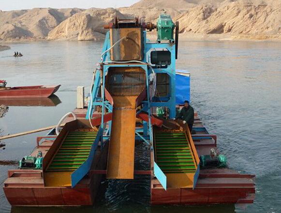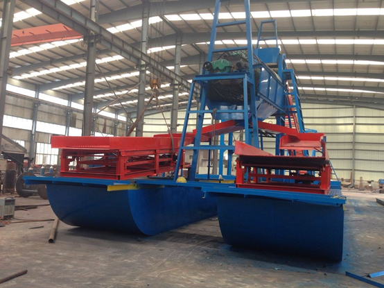 從而解決了溜格的板結(jié)現(xiàn)象,增加金的回收率。由于鼓動溜槽是間斷排出精礦,所以產(chǎn)率小,富集比要比跳汰機高多倍,產(chǎn)量是比跳汰機高多。沙金船