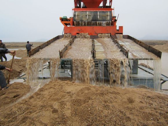 沙、金同時提取,今年國內(nèi)沙子價格較高,所以客戶要求沙金同時提取。沙子采用輸送桿輸送到河道兩邊,黃金留在鼓動溜槽內(nèi)。產(chǎn)量150t/h。采用雙鼓動溜槽。我公司鼓動溜槽現(xiàn)已**出第五代及第四代自動排礦型。