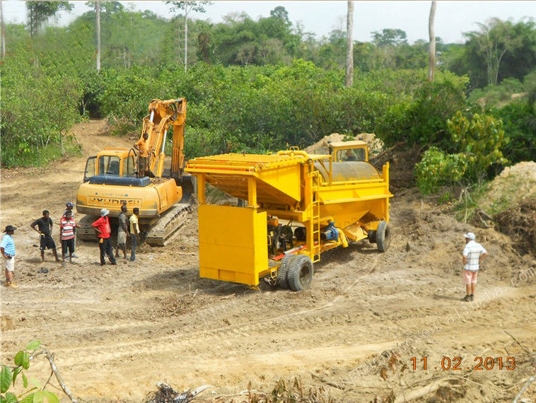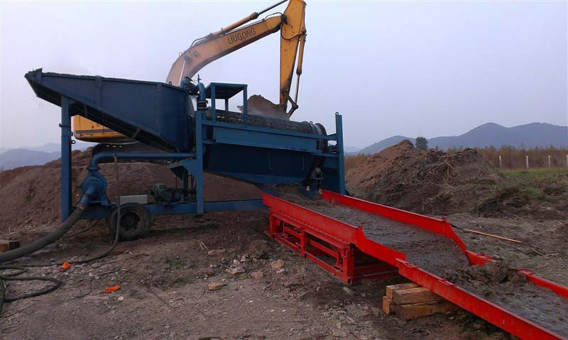 采用挖掘機或砂泵將礦料上至沙金礦設備后,沙金礦設備是一整套的篩分洗選設備,具有很多的功能,如:承載礦料、針對含泥量高的礦料進行清洗,稀釋、絞泥,然后針對礦料進行篩分工作,將石頭篩分出去,沙金礦這種石頭往往都是廢料,是不含有黃金的,如果有的氧化石料里面含有黃金,可以在篩分出去后再進行破碎的,將這種黃金從石頭的包裹中破碎出來,再進行回收的。
